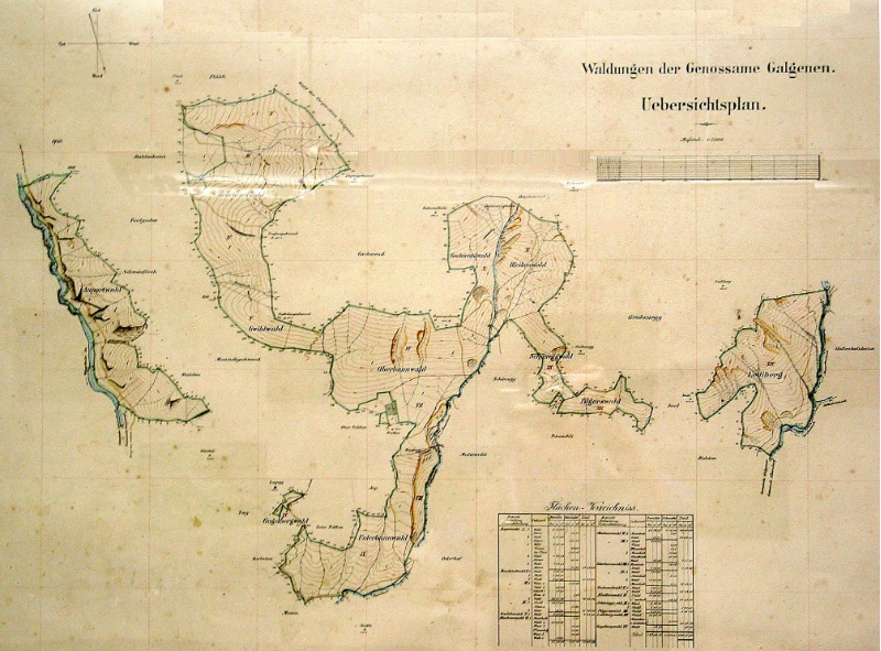 Die alte Übersichtskarte zeigt die Waldungen der Genossame auf dem Gemeindegebiet Galgenen.